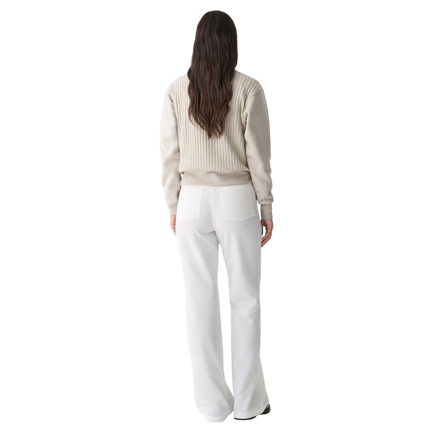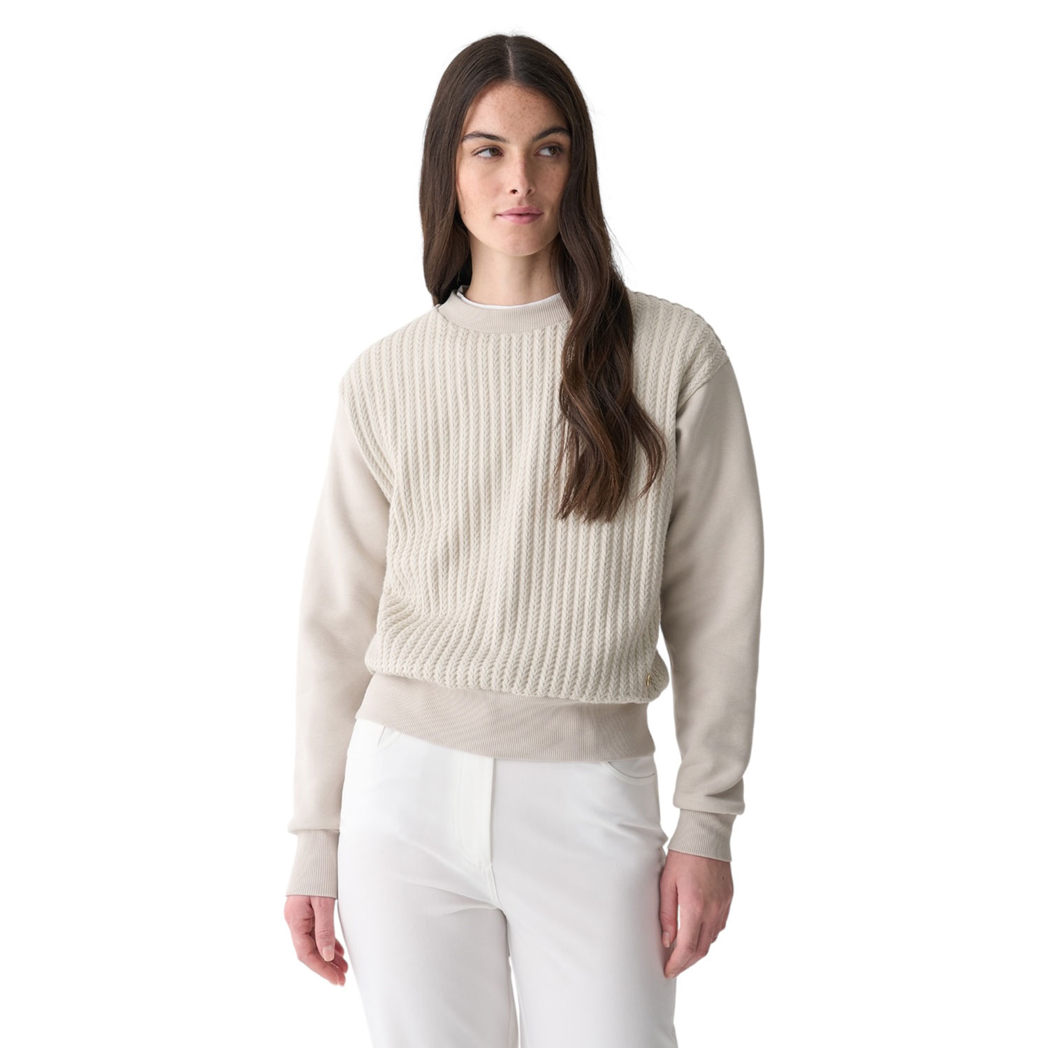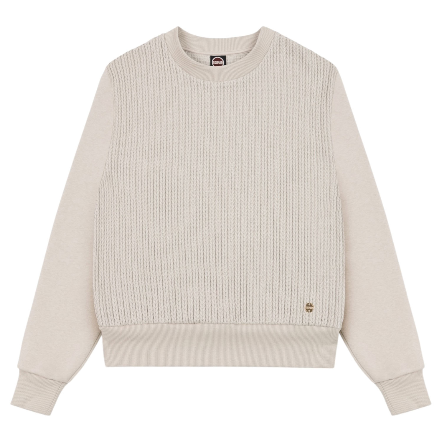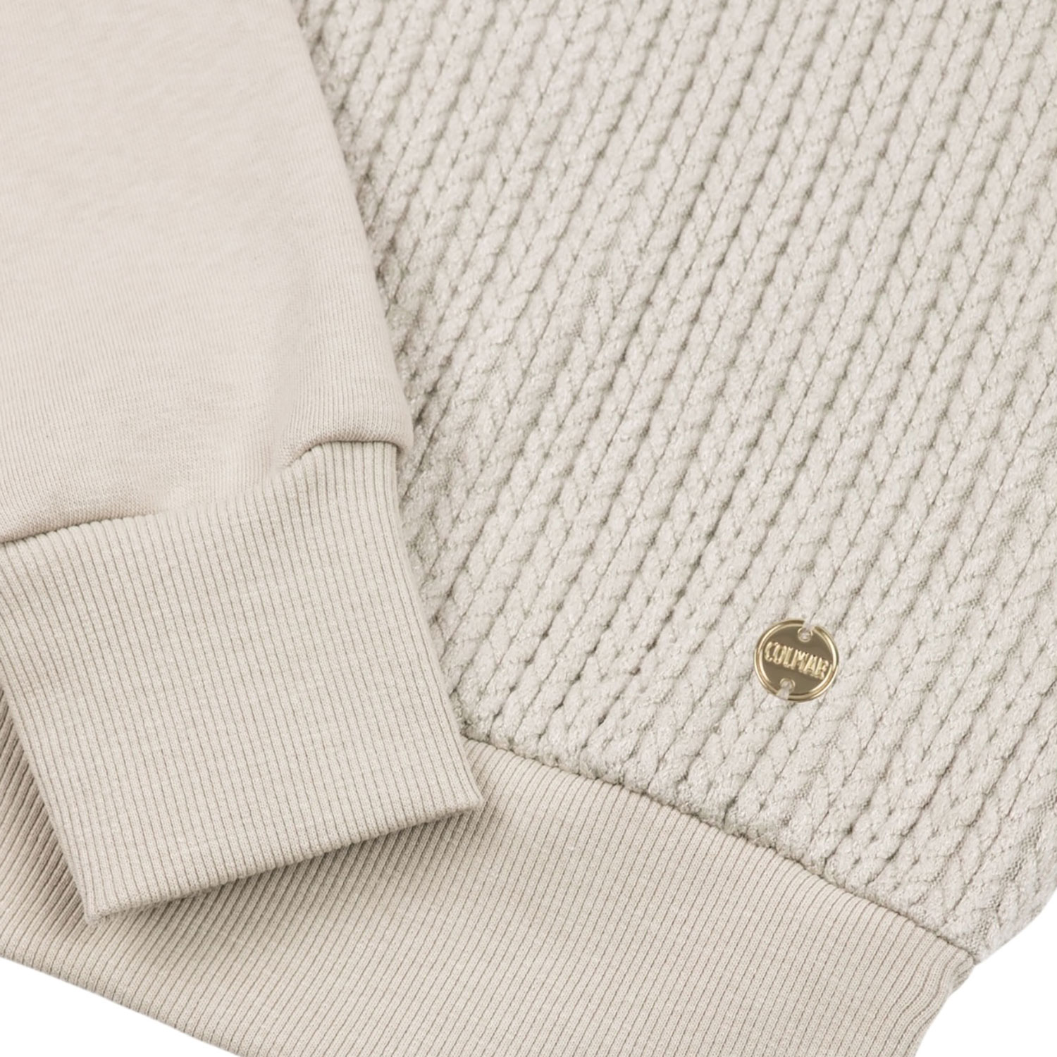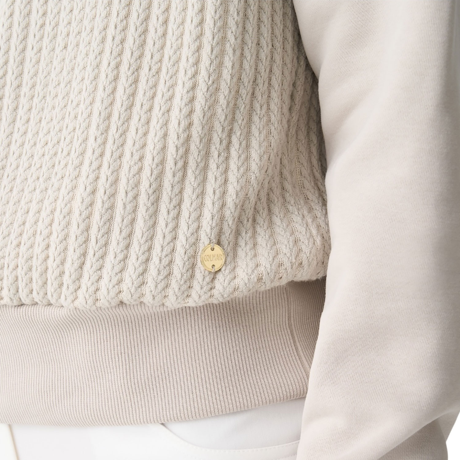 Caratterizzata da una lavorazione a trecce e da maniche in morbida e calda felpa, questo capo unisce comfort e femminilità. Il collo, il fondo e i polsini, in costina tono su tono, garantiscono una vestibilità perfetta, mentre la medaglietta logata applicata sul fondo aggiunge un tocco di eleganza.